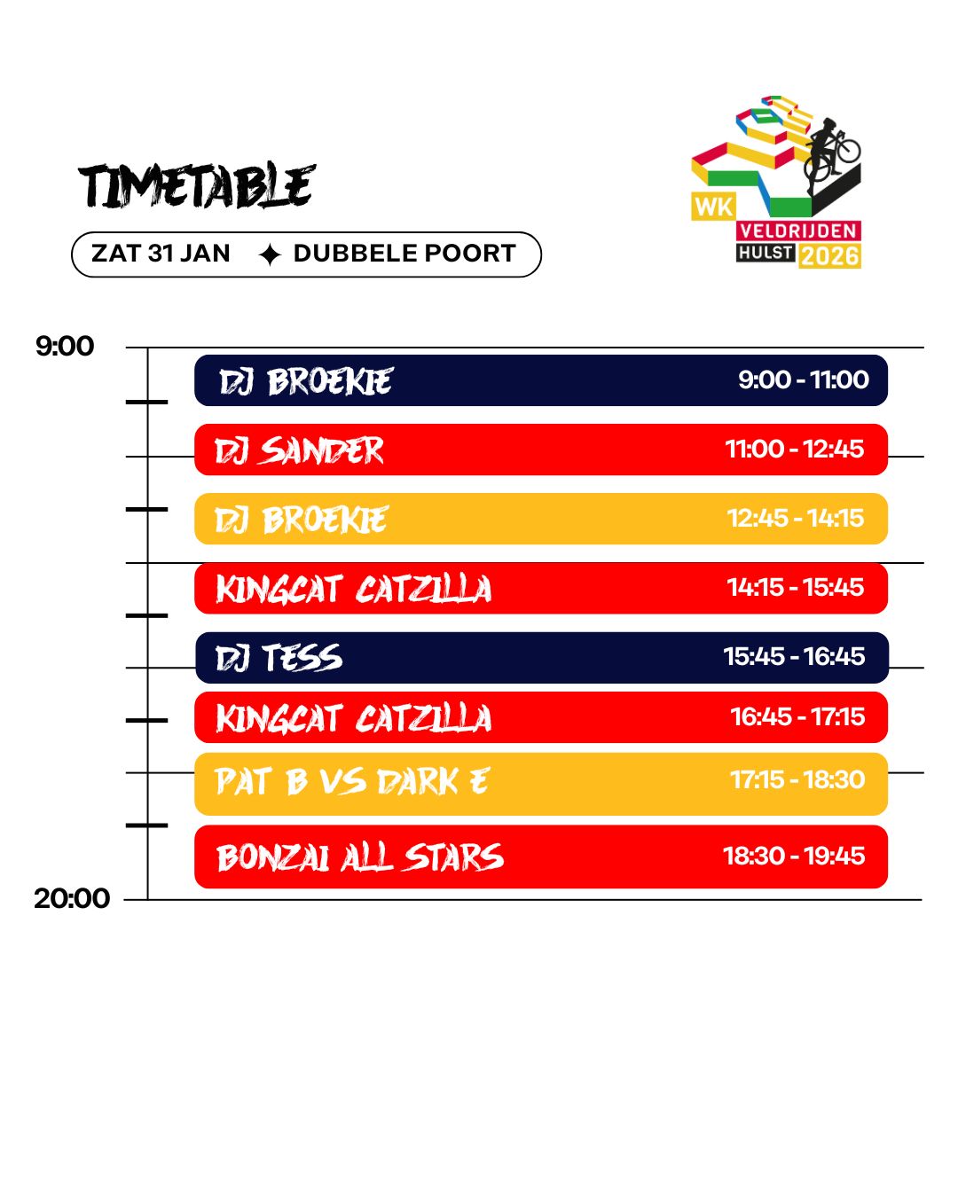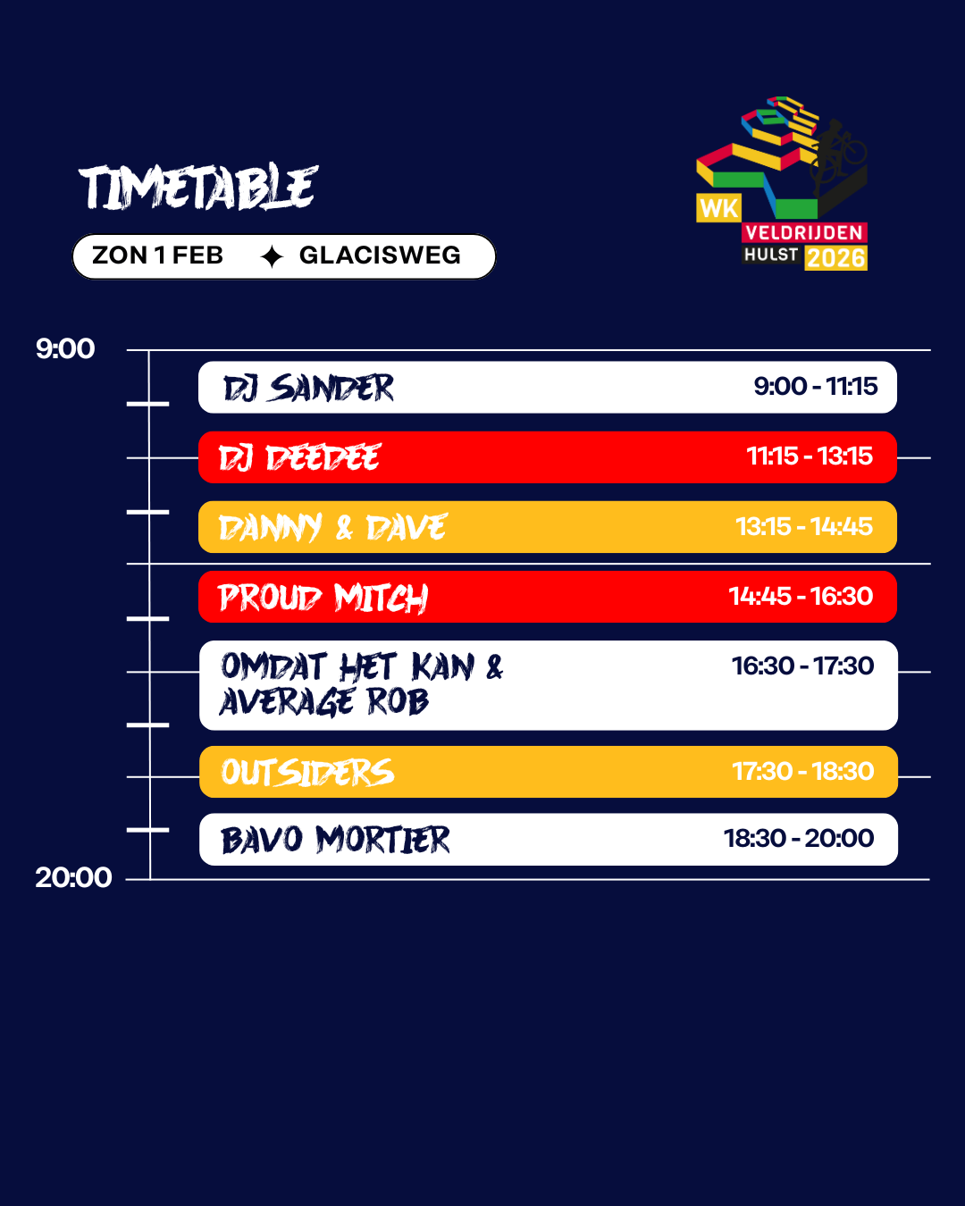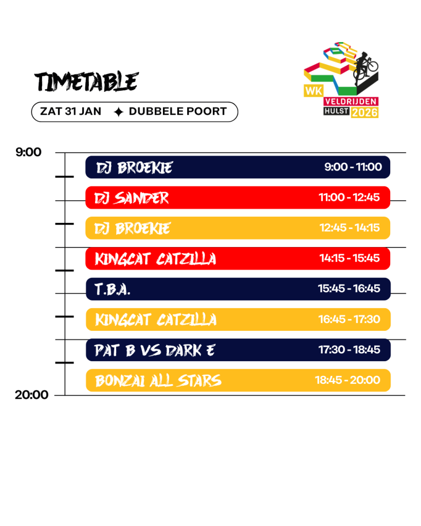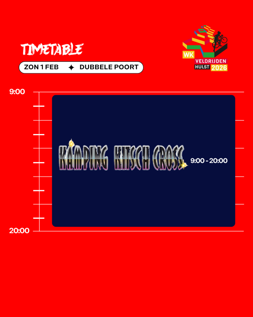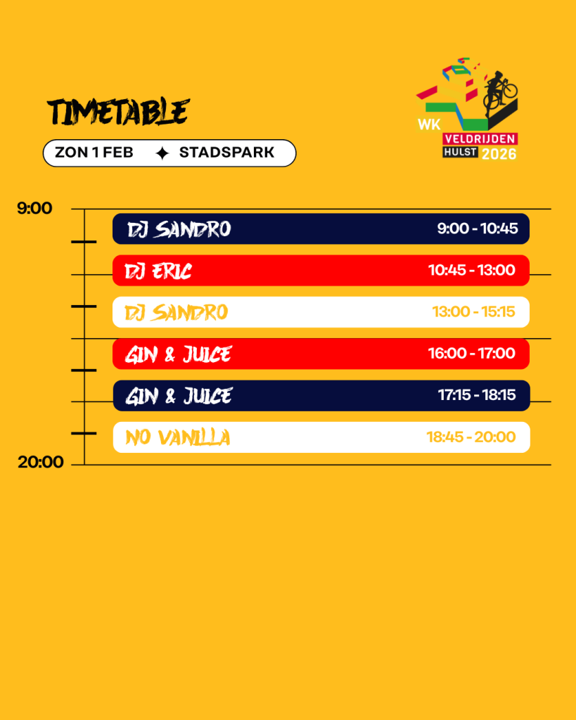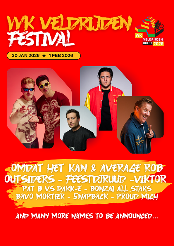 Tussen de wedstrijden door, en zeker na de races, is er altijd muziek, sfeer en actie. Dit is Hulst als crossfestival: energie, beats, feest en sport samengebracht op één plek. Kom kijken, dans mee en beleef het WK Veldrijden 2026 zoals nooit tevoren!