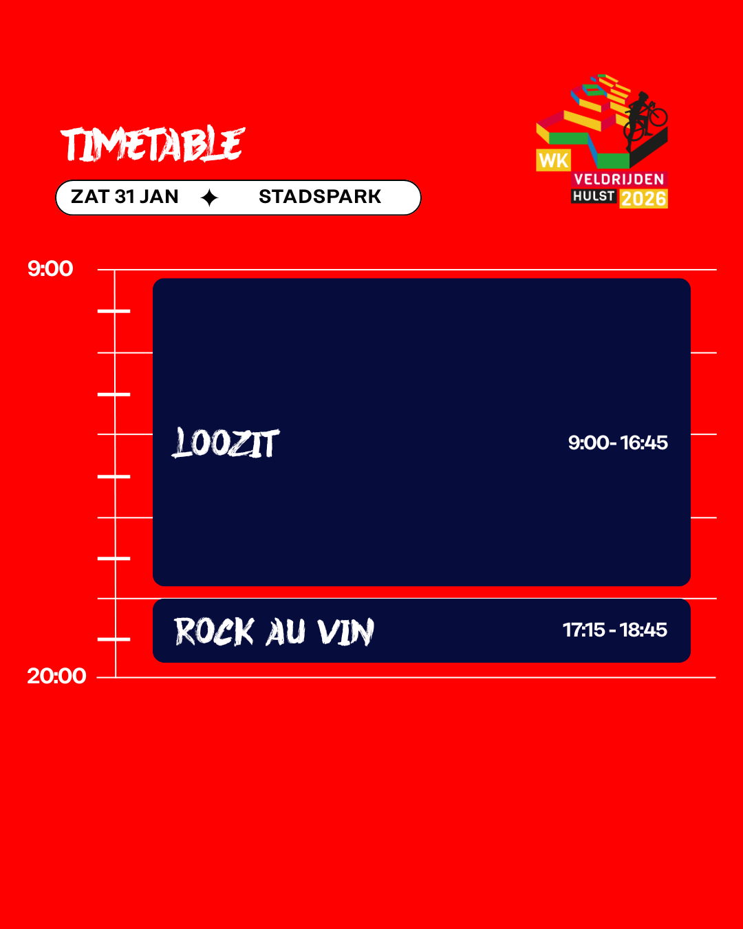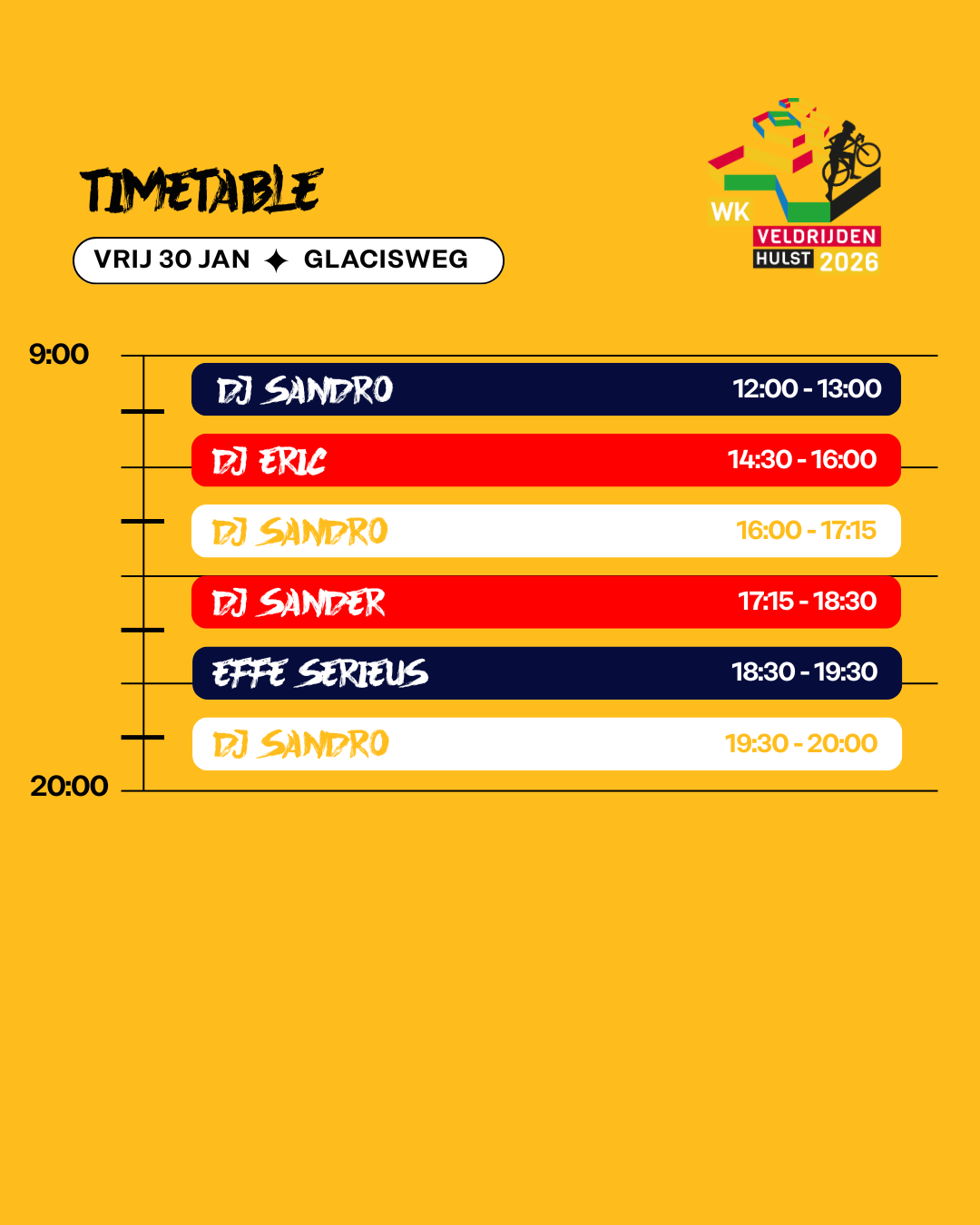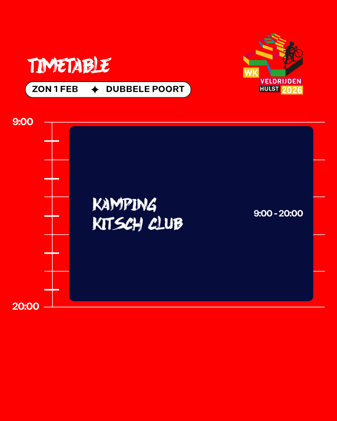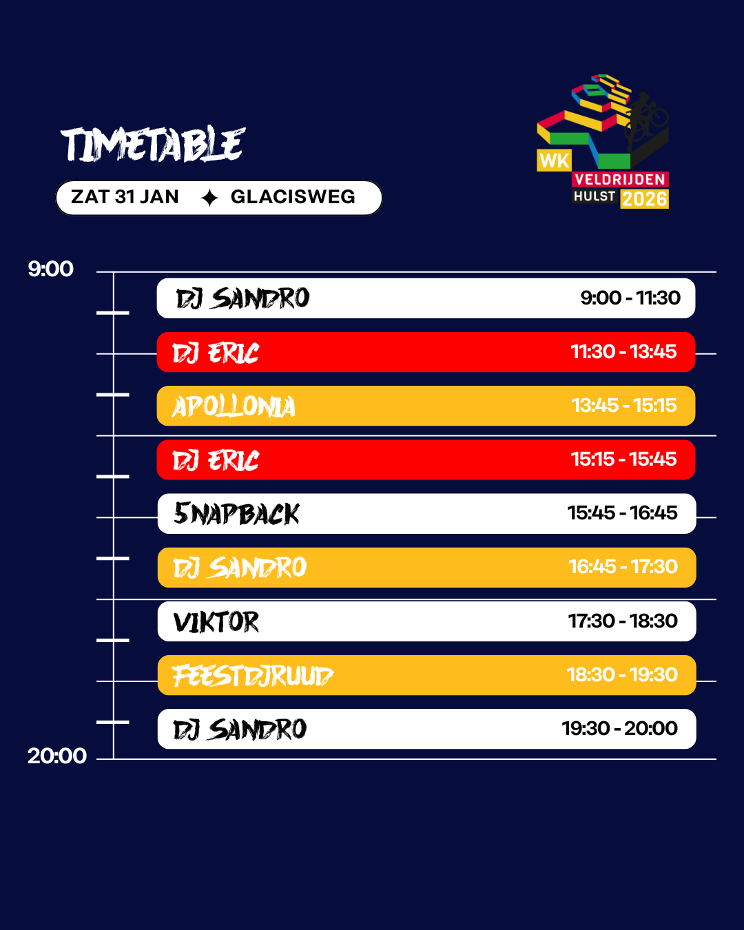 Tussen de wedstrijden door, en zeker na de races, is er altijd muziek, sfeer en actie. Dit is Hulst als crossfestival: energie, beats, feest en sport samengebracht op één plek. Kom kijken, dans mee en beleef het WK Veldrijden 2026 zoals nooit tevoren!