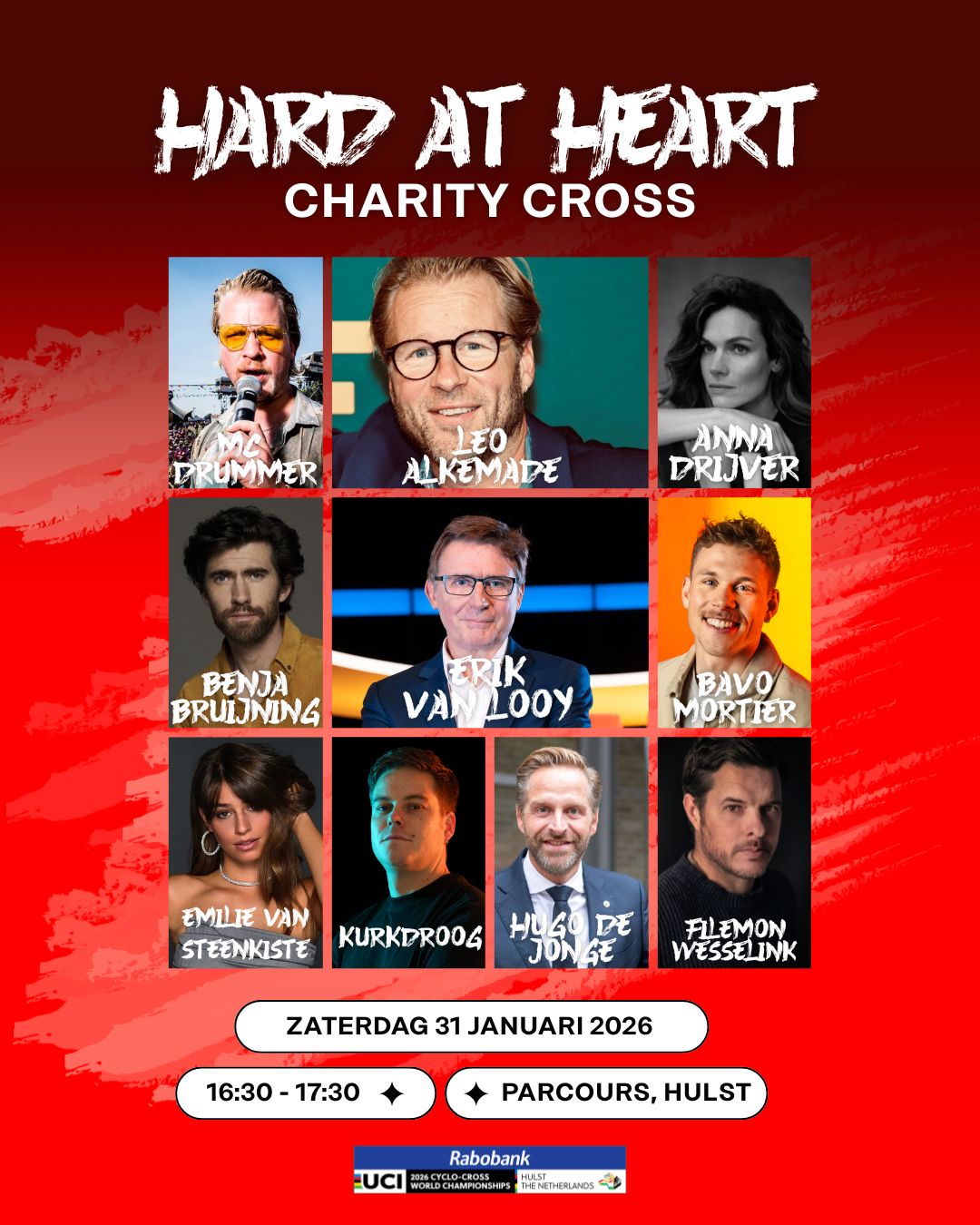 Op zaterdag staat het WK-terrein helemaal in het teken van warmte, energie en emotie tijdens de Hard at Heart Charity Cross. Hier draait het niet alleen om snelheid, maar vooral om verhalen, betekenis en samen iets moois neerzetten. En dat allemaal voor het goede doel. Bekende gezichten stappen samen met een “hero” – iemand met een persoonlijk verhaal, drive of missie – in duo op de fiets en nemen het tegen elkaar op in een unieke, hartverwarmende wedstrijd.